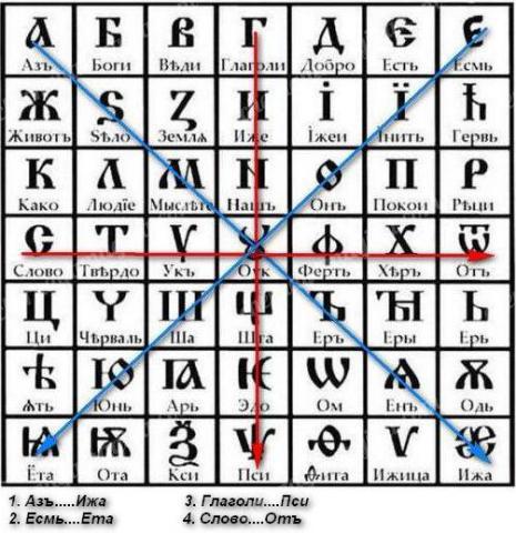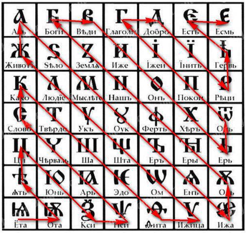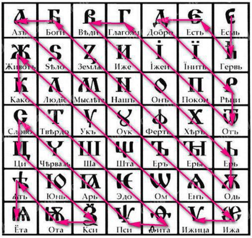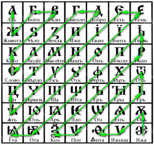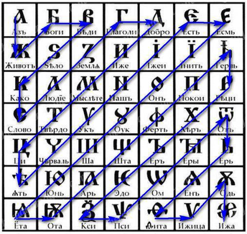 Аз, живите боги, веди зело како, слово люди земля глаголи, добро иже мыслите твердо цы, ять червль ук наш ижеи есть, есмь инить он оук ша юн ёта, ота арь шта фердь покой гервь, рецы херь ер эдо кси, пси ом еры от, ерь ен фита, ижица одь, ижа.