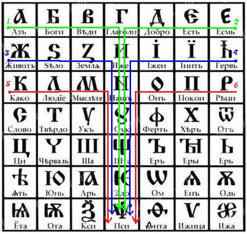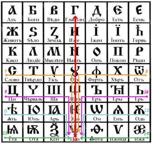Аз Боги Веди доходим до центрального столбца- прочитываем его Глаголи Иже Наш Оук Шта Эдо Пси останавливаемся и начинаем вплетать в этот центр , с конца той строки с которой начали Есмь Есть Добро и опять прочитываем центральный столбец( как бы вплетаем в него с разных сторон буквы строки) получается Аз. Боги. Веди. - Глаголи. Иже. Наш. Оук. Шта. Эдо. Пси. - Есмь. Есть. Добро. - Глаголи. Иже. Наш. Оук. Шта. Эдо. Пси.
