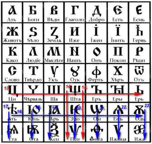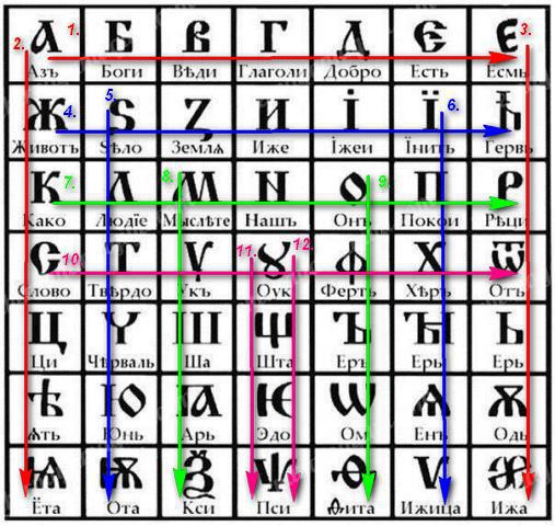 Строка Аз-Есмь и столбцы Аз-Ёта, Есмь-Ижа. Строка Живите-Гервь и столбцы Зело-Ота, Инить-Ижица. Строка Како-Рецы и столбцы Мыслите-Кси, Он-Фита. Строка Слово-От и столбцы Оук-Пси, Оук-Пси. Строка Ци-Ерь и строка Шта-Пси, Шта-Пси. Строка Ять-Одь и столбцы Ять-Ёта, Юн-Ота, Арь-Кси, Эдо-Пси, Ом-Фита, Ен-Ижица, Одь-Ижа.