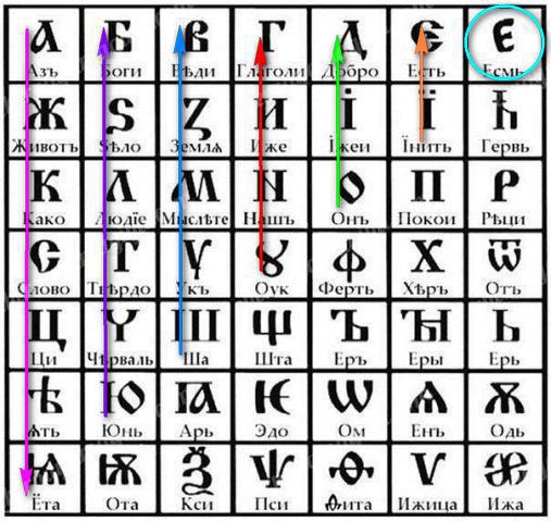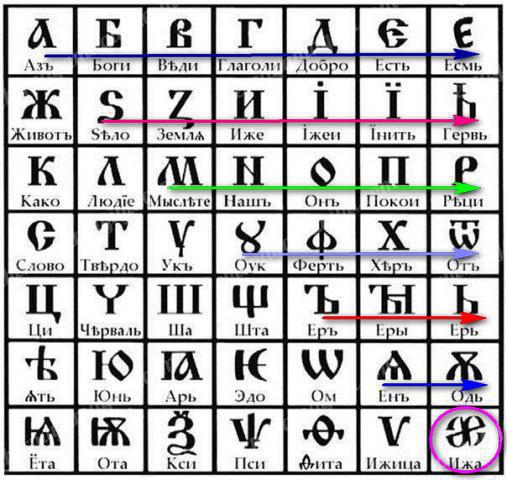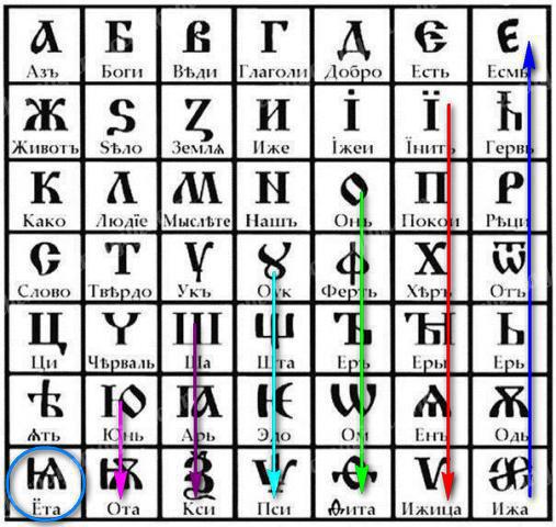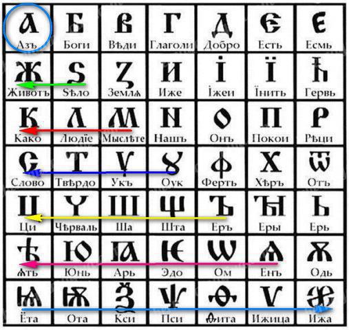 Аз-Есмь. Зело-Гервь. Мыслите-Рецы. Оук-От. Ер-Ерь. Ен-Одь. Ижа. Ижа-Есмь. Инить-Ижица. Он-Фита. Оук-Пси. Ша-Кси. Юн-Ота. Ёта. Ёта-Ижа. Ен-Ять. Ер-Цы. Оук-Слово. Мыслите-Како. Зело-Живите. Аз. Аз-Ёта. Юн-Боги. Ша-Веди. Оук-Глаголи. Он-Добро. Инить-Есть. Есмь.
