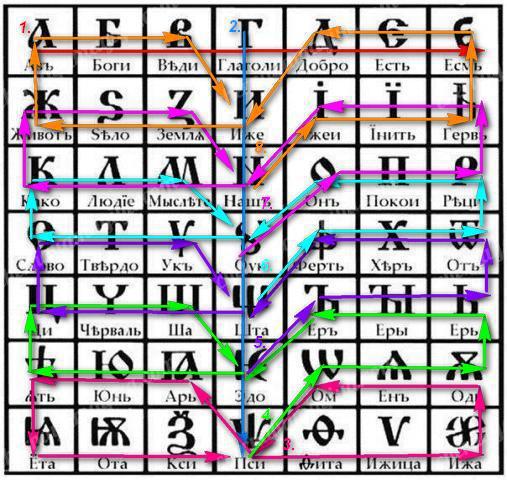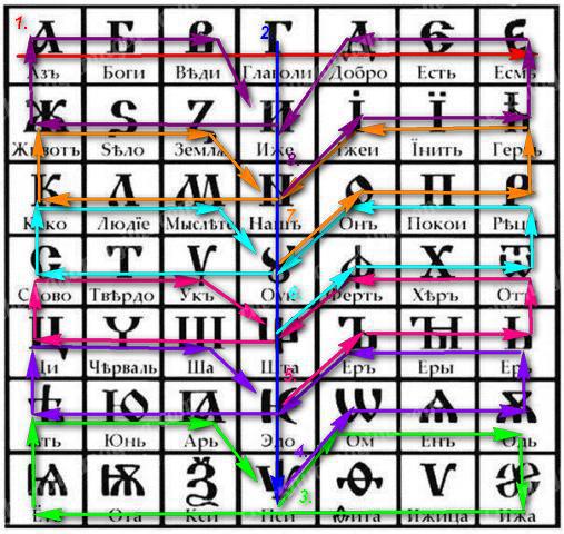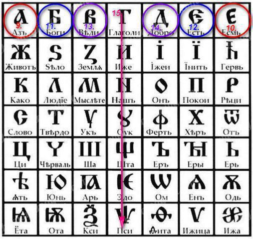 1 СТРОКА Аз - Есмь. Затем, 4 СТОЛБЕЦ Глаголи - Пси.далее читать с низу в верх6 восьмерочка